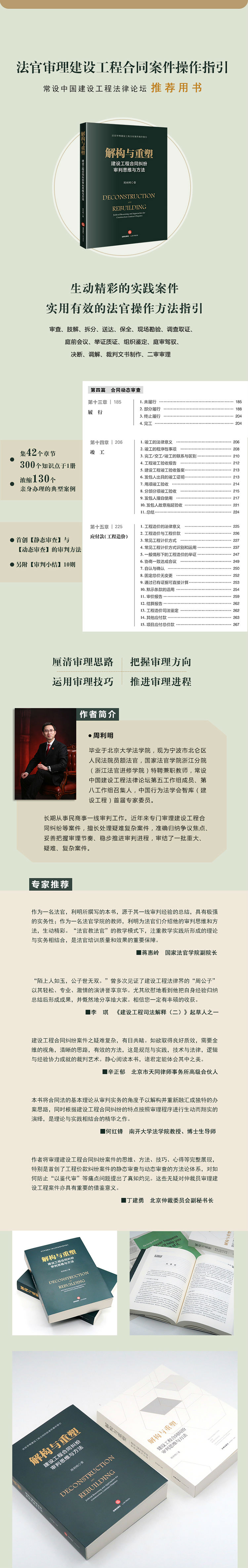 内容简介 《解构与重塑:建设工程合同纠纷审判思维与方法》的亮点有以下三个:一是将工程价款争议案件分为静态审查与动态审查的九个步骤,各步骤之间存在严密的逻辑递进关系,所有案件均可通过该方法予以肢解、拆分并分别审查、厘清思路,此为笔者所原创并力推的经典之处;二是结合《建设工程司法解释(二)》,在有关工程造价、质量、工期司法鉴定的运用上,既总结既有规则,又有所创新和完善,侧重于实践可操作性,对提高司法鉴定的质量和效率有所裨益;三是*以法官作为裁判者的视角,从收案、审案、断案的自然流程角度考虑案件,每个步骤既结合民事诉讼法等程序法的规范操作,又针对建设工程合同纠纷的特殊性作了一些简化、优化以及扩充,完整呈现程序法如何为具体的bu门法所服务。